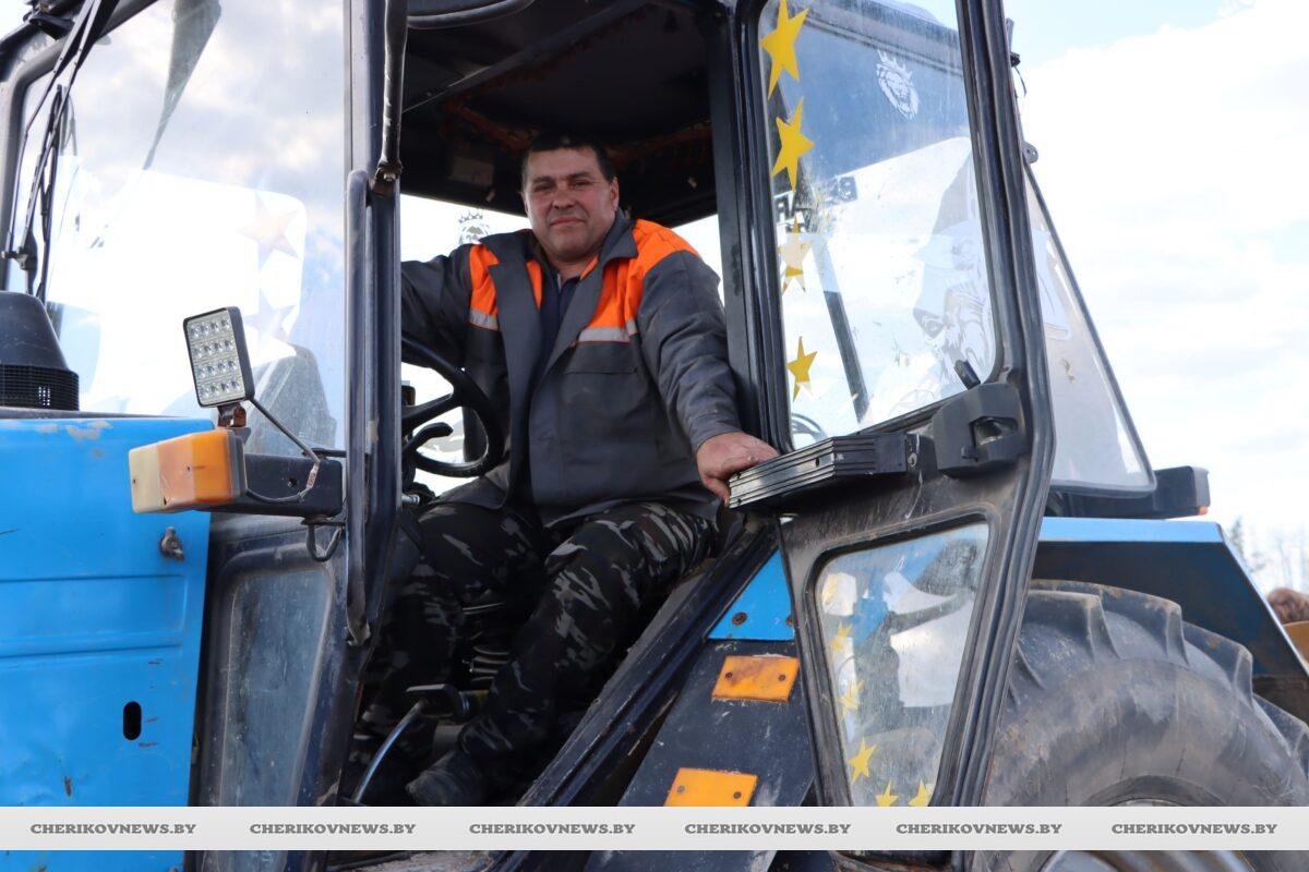 На участке рядом с деревней Глинь работает механизатор Александр Старожук. Сев для него — дело привычное. Семена протравлены, что значительно повышает их жизнеспособность и позволяет достигнуть точки роста в оптимальные сроки. Механизатор рассказал, что всем необходимым обеспечен, обедами кормят вкусными.