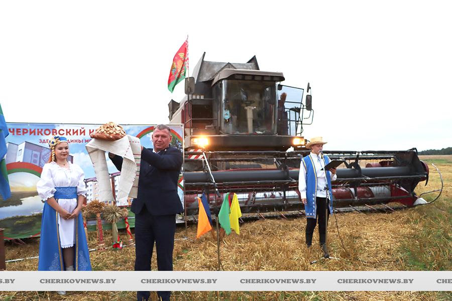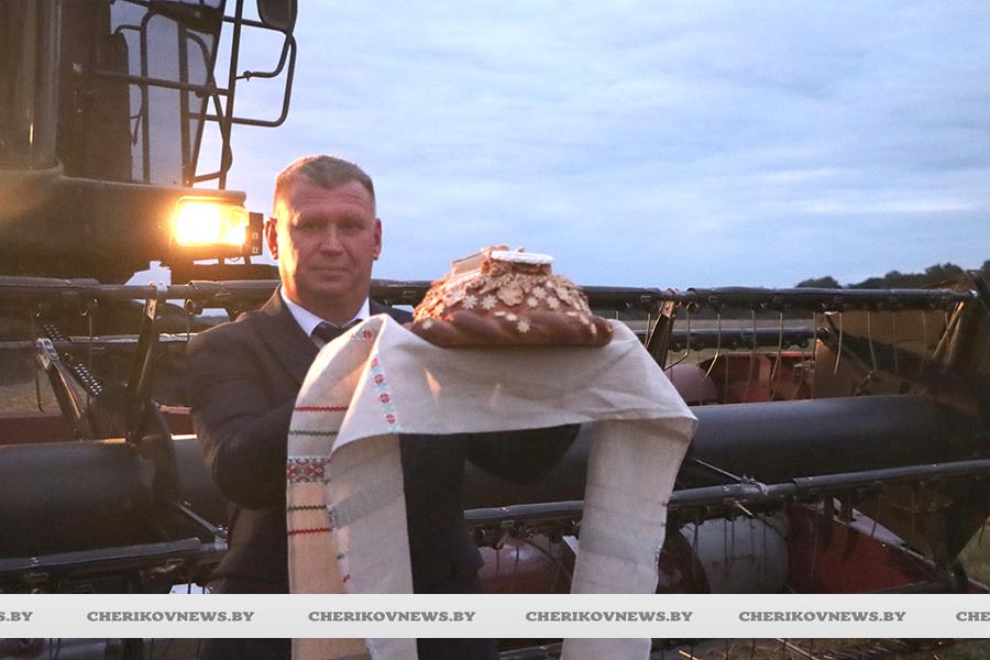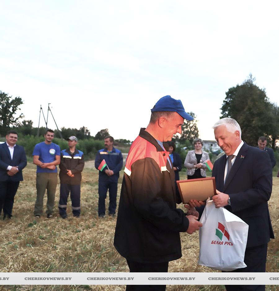 Среди золотых полей каравай от губернатора Могилевской области Анатолия Исаченко вручили главе Чериковского района Алексею Жерносекову в знак благодарности всем, кто своим трудом приближал этот день.