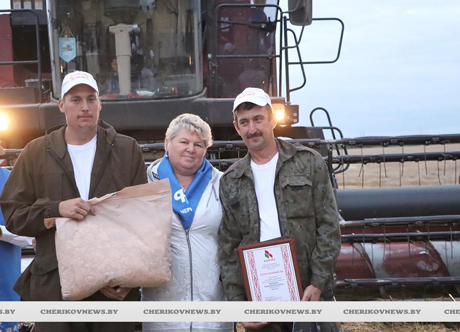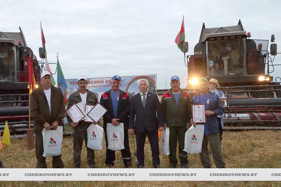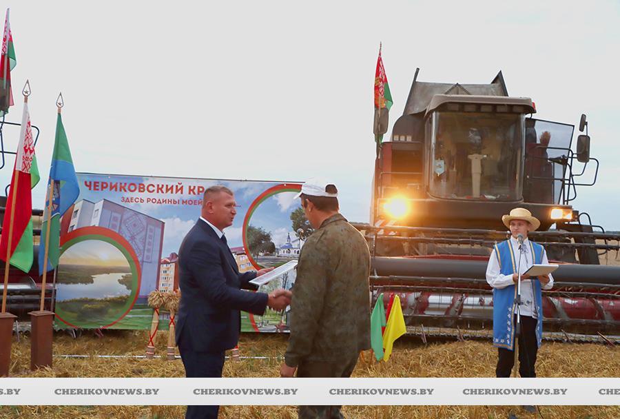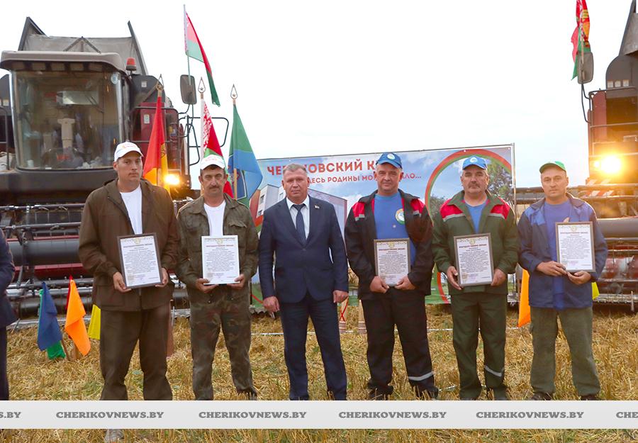 Прямо в поле, среди золотых колосьев, председатель райисполкома Алексей Жерносеков поздравил настоящих героев жатвы и вручил заслуженные награды экипажу ОАО «Чериковрайагпромтехснаб» в составе Игоря Колосова и Владимира Михненко, комбайнеру Сергею Лукьяненко, семейному экипажу КСУП «Агрокомплекс «Светлый» Виталию и Владиславу Цыганковым. Эти люди – олицетворение трудолюбия, мастерства и преданности своему делу. Опытные труженики, вносящие свой вклад в продовольственную безопасность страны, гордятся своей почетной миссией и самой мирной профессией хлеборобов.