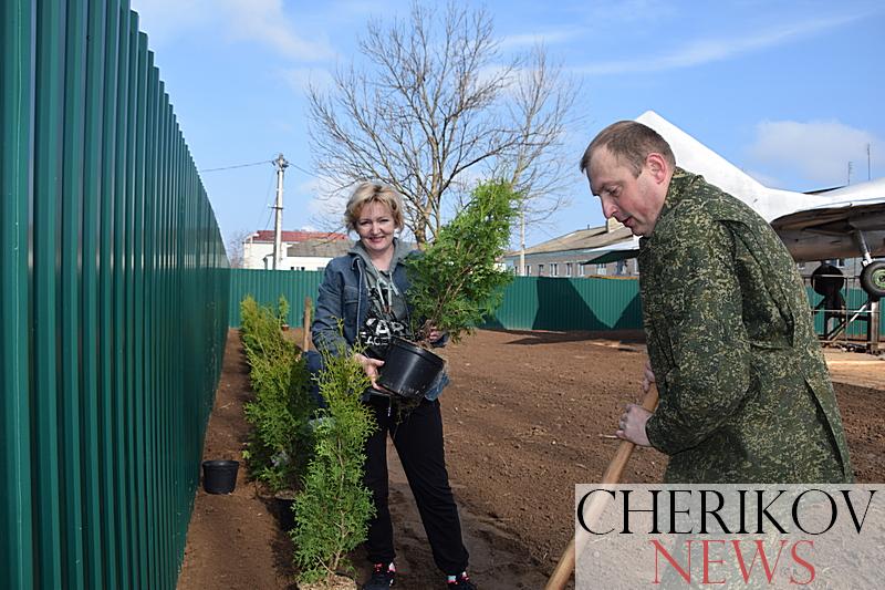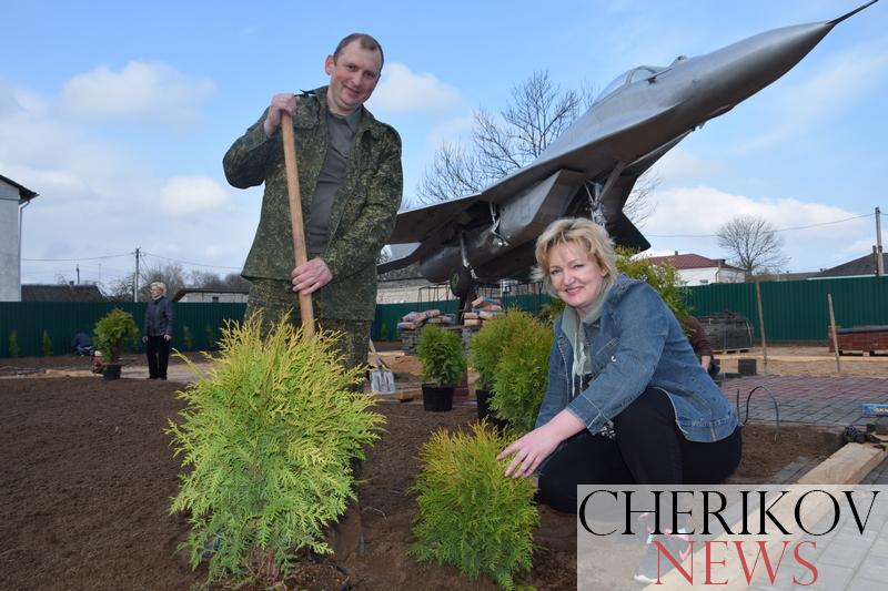 Более двадцати человек занималось благоустройством возле районной достопримечательности — истребителя. Здесь трудились председатель районного исполнительного комитета Александра Михеенко, сотрудники военного комиссариата Чериковского и Краснопольского районов, представители структурных подразделений райисполкома. В этот день здесь были высажены декоративные хвойные растения: кипарисовик, туи, можжевельник, лиственницы, ивы, кустарники лаванды.