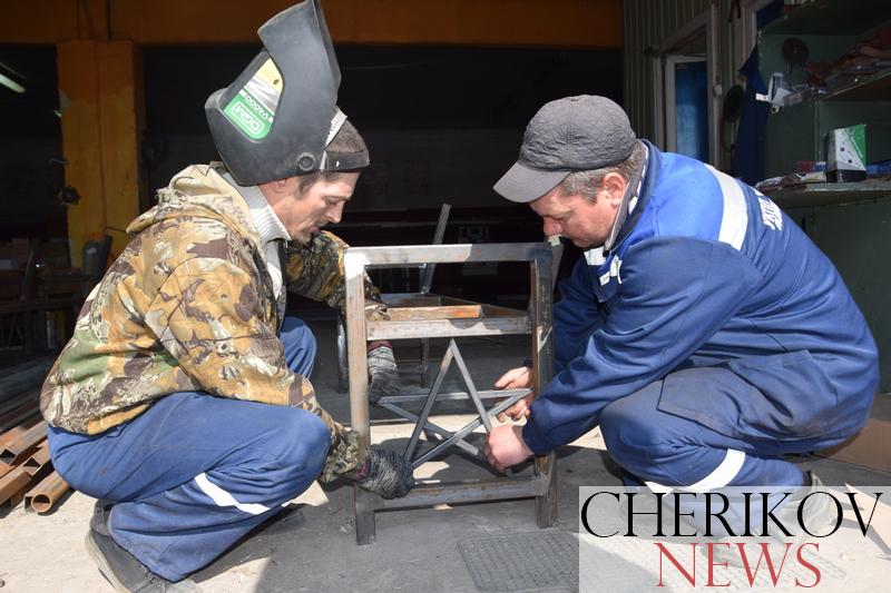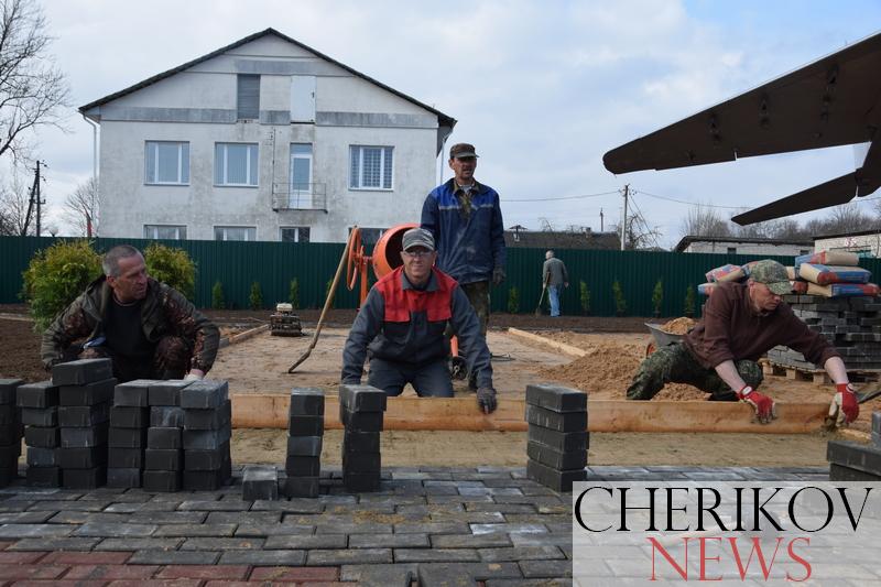 Работники УКПП «Чериковский жилкоммунхоз» трудятся на данном объекте не покладая рук. Так вскоре в центре данной архитектурной композиции появится красная звезда. Окружать ее будут тематические скамейки, которые были проанонированы нам во время субботника. Как вы можете увидеть на фото, работа над ними ведется активными темпами. Кроме этого работниками коммунального хозяйства производилась покраска бордюрного камня на дорогах, побелка придорожных деревьев.
