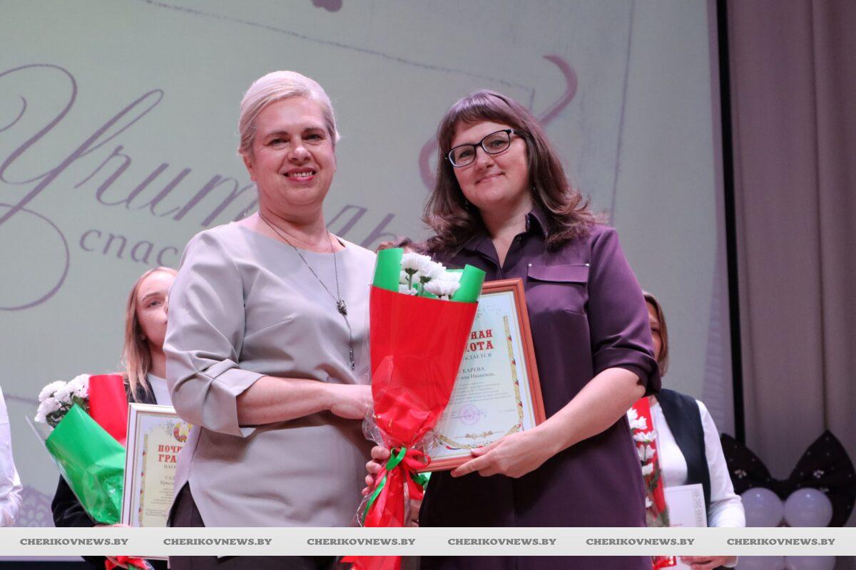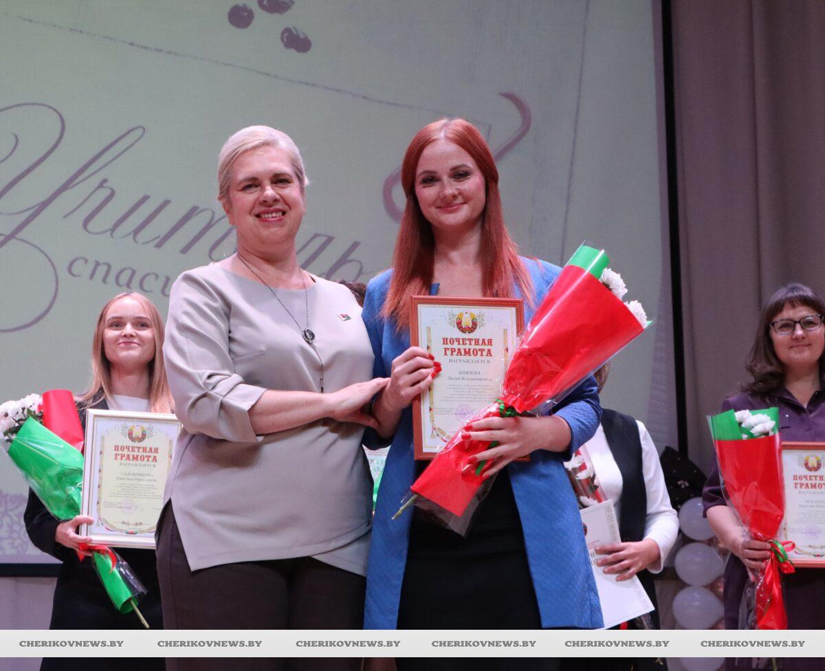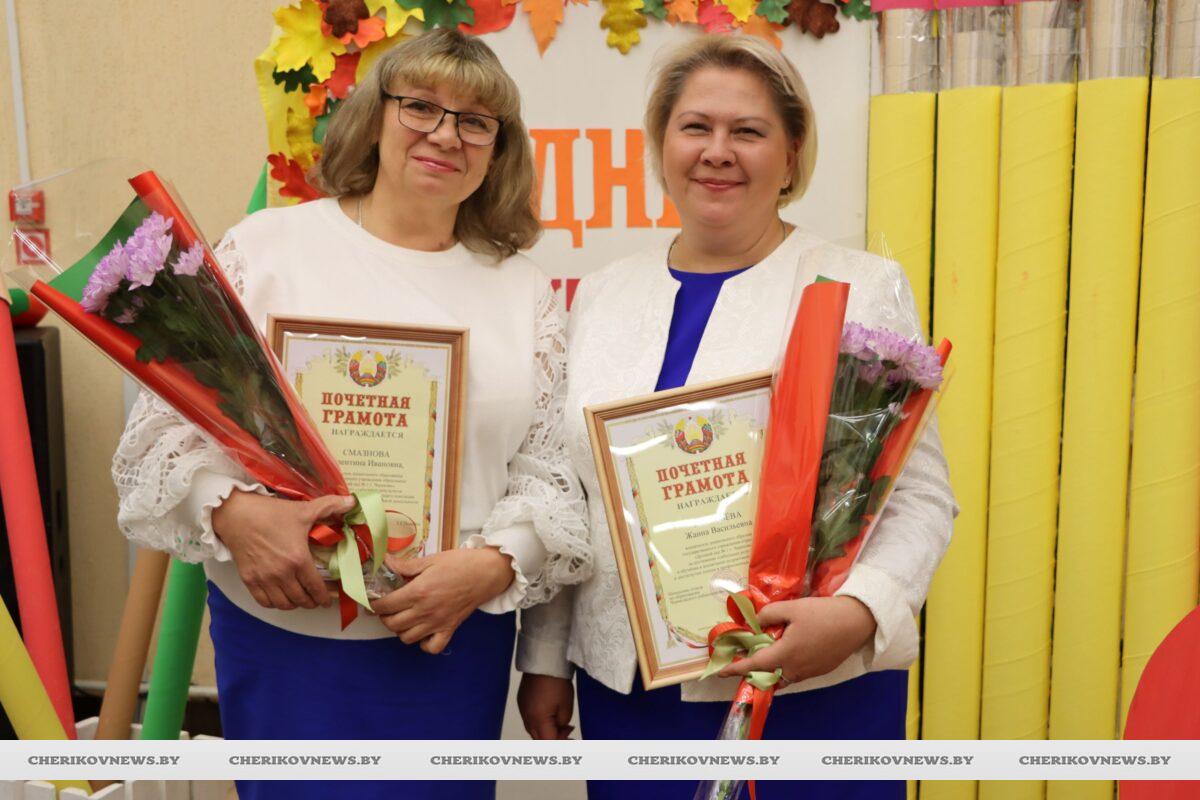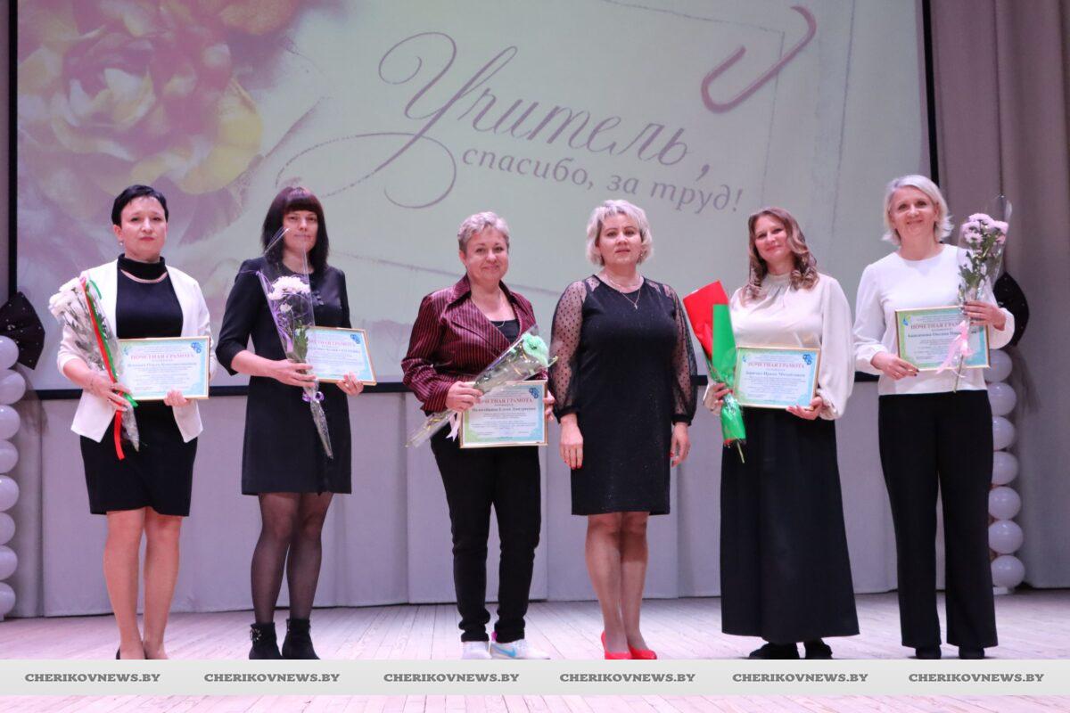 Почетной грамотой Чериковского районного исполнительного комитета награждена заместитель директора по учебной работе СШ №1 г. Черикова Наталья Плохова. Благодарность Чериковского райисполкома объявлена учителю Лобановской БШ Леониду Лукашкову. Благодарственным письмом Чериковского районного Совета депутатов награждена заведующий отделением дополнительного образования ЦТДиМ г. Черикова Оксана Довлыева. А также сразу троим педагогам района были вручены Грамоты Министерства образования Республики Беларусь — учителю-дефектологу СШ №2 г. Черикова Оксане Фатеевой, учителю белорусского языка и литературы СШ №1 г. Черикова Татьяне Гордеевой и учителю географии СШ №2 г. Черикова Светлане Федосовой.