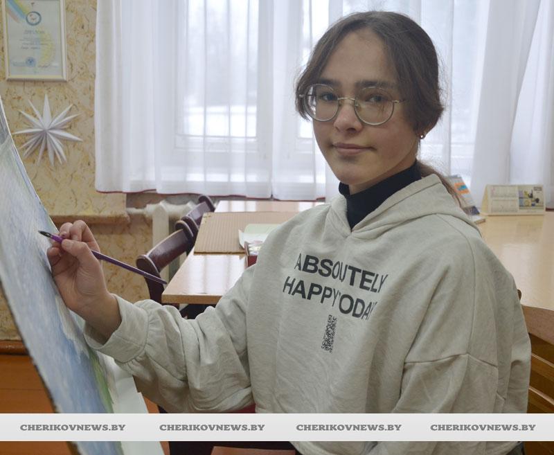 Очень красивую и необычную работу, которая относит нас не в далекое прошлое, а раскрывает красоту Беларуси настоящей, выполнила юная художница ЦТДиМ г. Черикова — Мария Александренкова. Маша уже шестой год посещает кружок «Рисунок и живопись» педагога Аллы Сакович. И в этот раз на смотр-конкурс было решено нарисовать девушку, олицетворяющую нашу страну, с ее природными красотами, богатствами и архитектурными символами.
