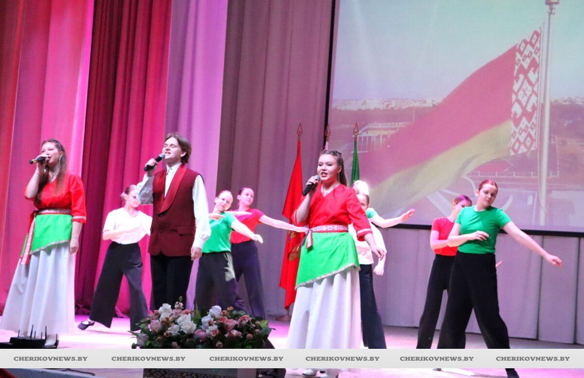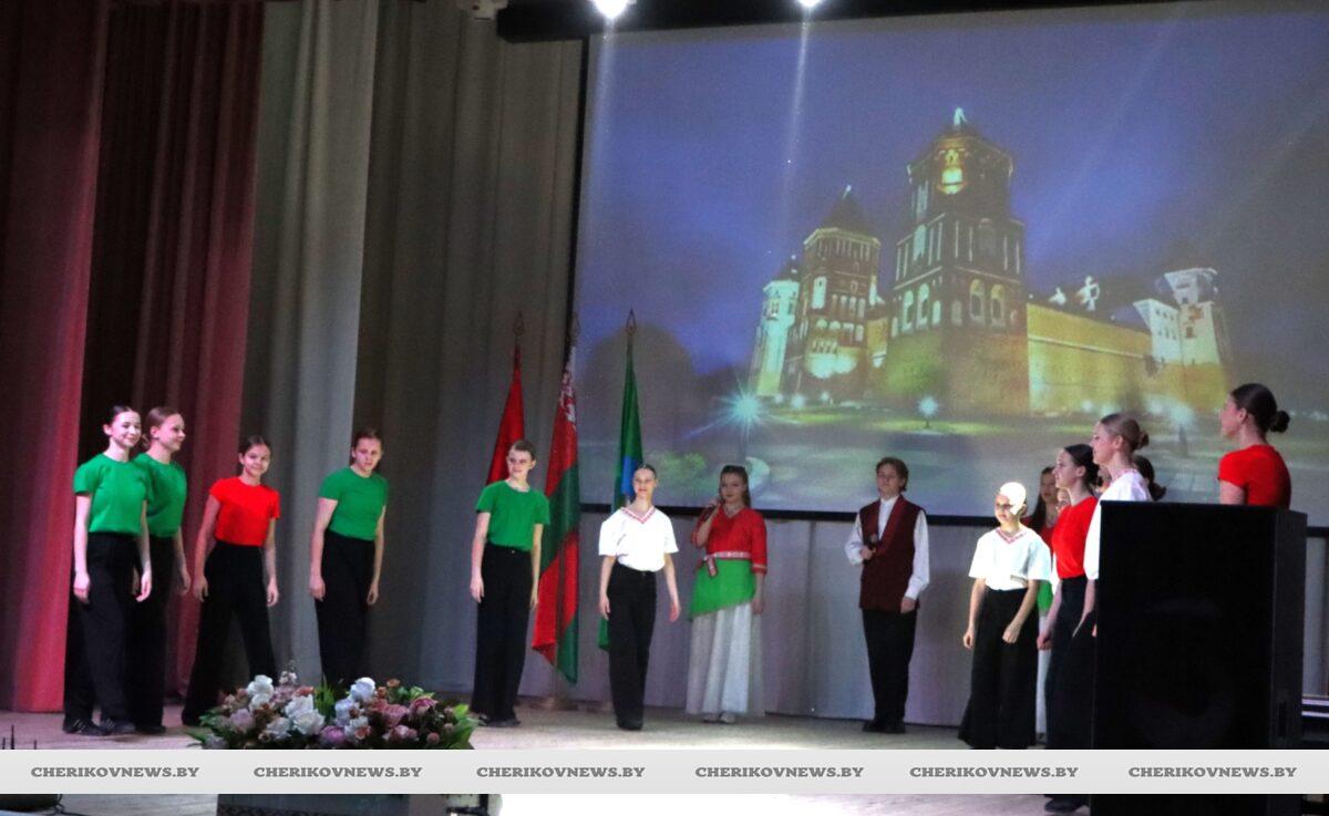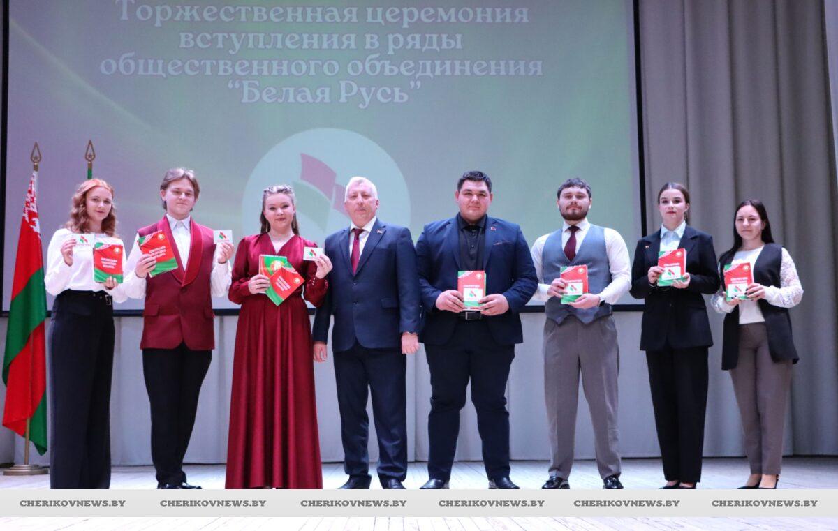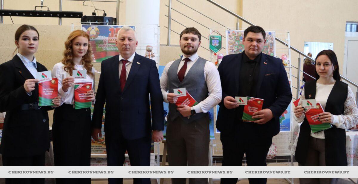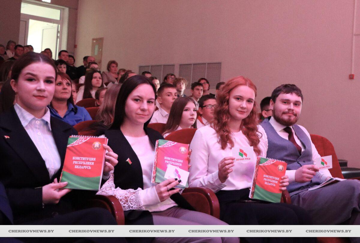 Для вручения билетов, значков Белорусского республиканского союза молодежи и Конституций Республики Беларусь на сцену поднялась первый секретарь Чериковского районного комитета общественного объединения «Белорусский республиканский союз молодёжи» Карина Халаева. 14 молодых людей в рамках проведения Всебелорусской акции «Мы – граждане Беларуси» получили членские билеты, значки и Конституцию Республики Беларусь, произнеся торжественное обещание БРСМ.