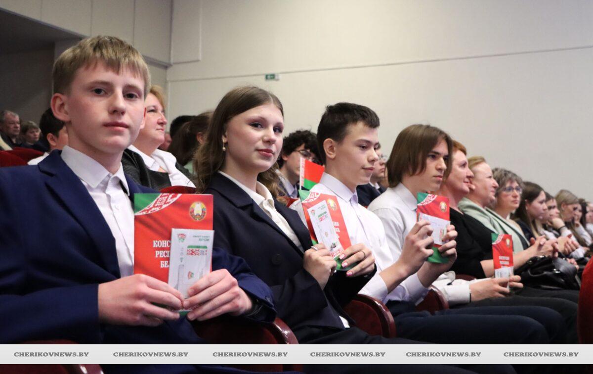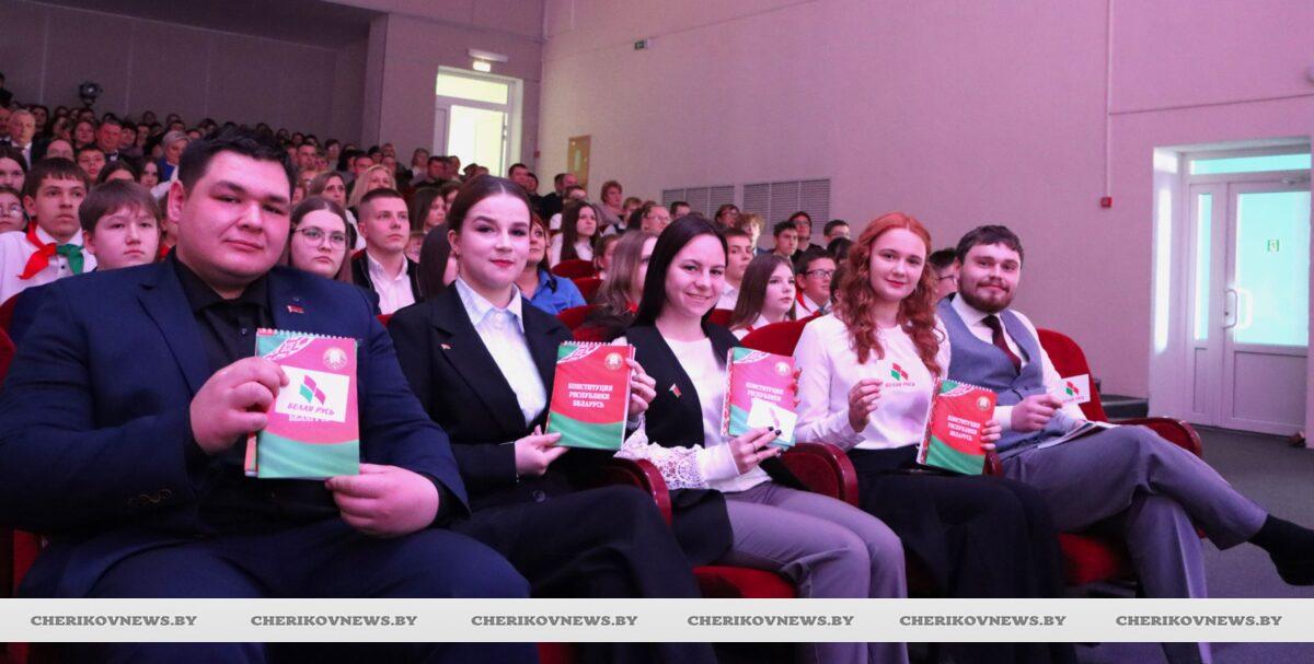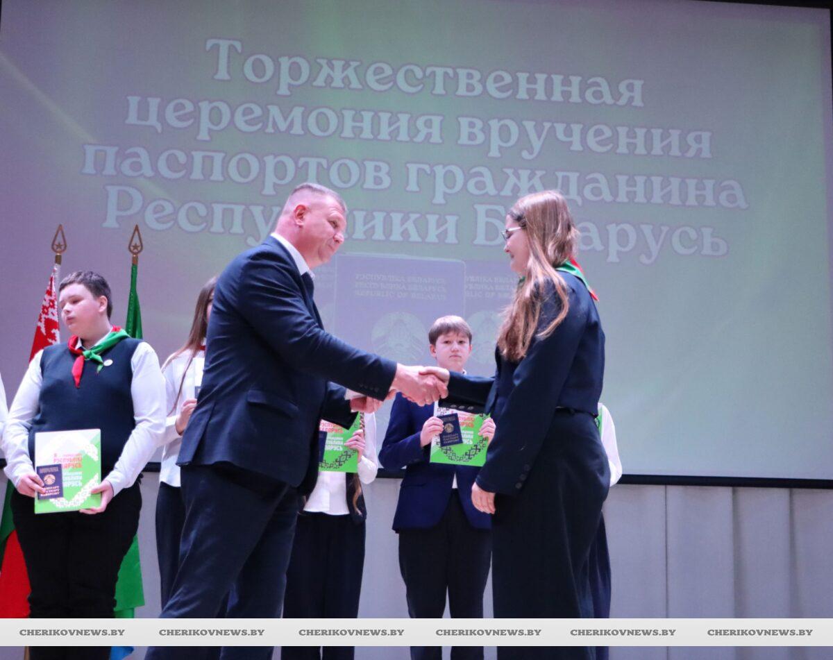 На районной сцене главный документ гражданина нашей страны, Конституцию Республики Беларусь и книгу «Я – гражданин Республики Беларусь» представителям молодого поколения Чериковщины вручил председатель райисполкома Алексей Жерносеков. Под аплодисменты зрительного зала за своим первым взрослым документом на сцену поднялись юноши и девушки. Каждому из них, пожимая руку и вручая паспорт, Алексей Владимирович сказал напутственные слова.