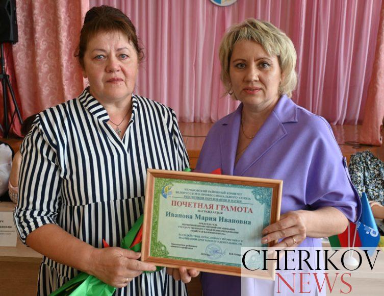 Почетными грамотами Могилевского областного комитета Белорусского профессионального союза работников образования и науки награждены заведующий ГУО «Детский сад № 1 г. Черикова» Анжелика Владимирова и учитель, председатель первичной профсоюзной организации ГУО «Средняя школа № 2 г. Черикова» Наталья Полюшуева.