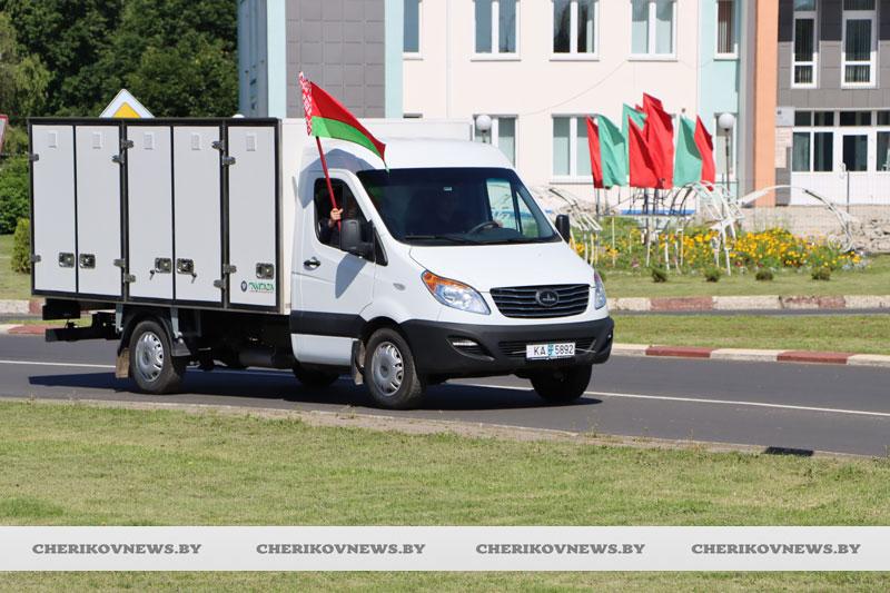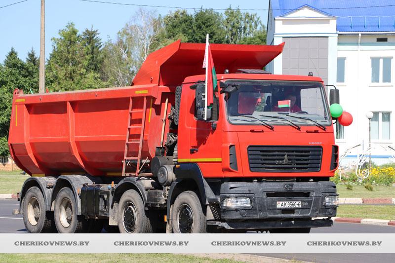 Изюминкой праздничного митинга и театрализованного шествия в Черикове 3 июля стал парад колесной техники, украшенной национальной символикой.