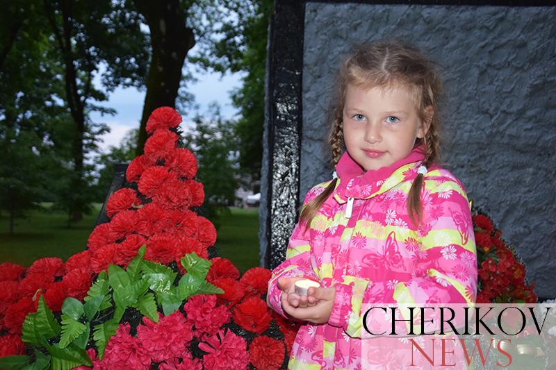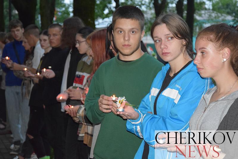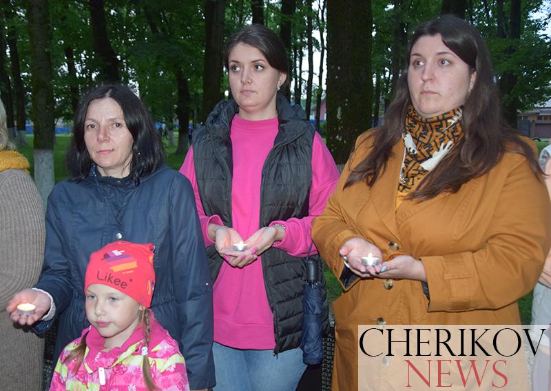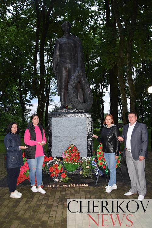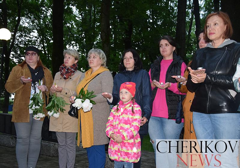 Каждый год 22 июня люди зажигают миллионы свечей и несут их к мемориалам памяти. В память о тех, кто отдал свою жизнь, защищая нашу Родину. О тех, кто умер от мучений и пыток в фашистских лагерях, кто сгорал в газовых камерах и взорвался на снарядах. Кто бросался под танки и своим телом защищал от обстрела детей и стриков. В память о них в Парке Победы города Черикова зажглись свечи. В этот вечер там прошла гражданско-патриотическая акция «Свеча Памяти», посвященная Дню всенародной памяти жертв Великой Отечественной войны. Отдать дань уважения погибшим в годы Великой Отечественной войны пришли заместитель председателя районного исполнительного комитета Лариса Осмоловская, председатель районного объединения профсоюзов Юлия Сивцова, председатель районной организации Белорусского профсоюза работников образования и науки Наталья Лазаренко, председатель райкома профсоюза работников агропромышленного комплекса Оксана Дятлова, главные специалисты отдела идеологической работы, культуры и по делам молодежи райисполкома Яна Шуликова и Анжела Чурилова, активисты ОО «БРСМ», молодежь Черикова.