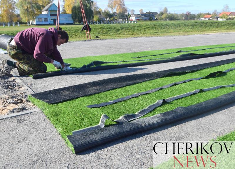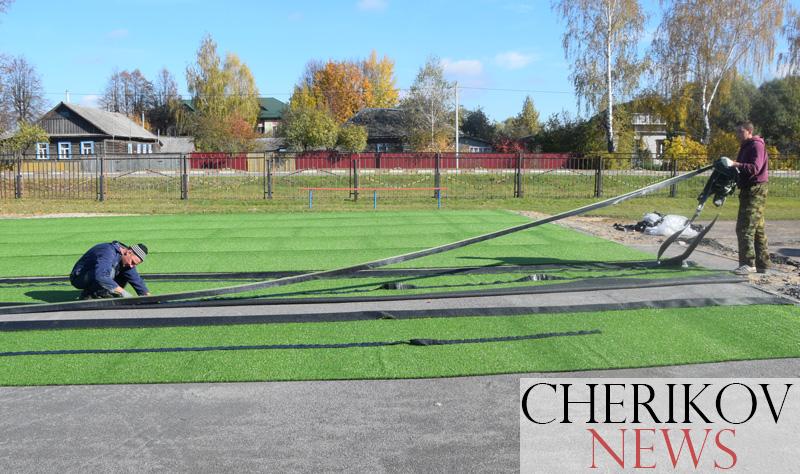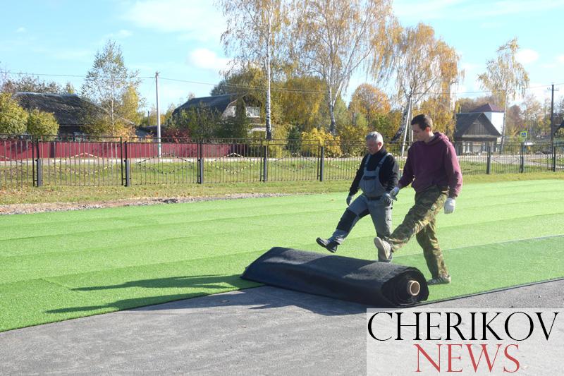 Площадка для мини-футбольного поля в Черикове начинает «зеленеть». Посмотрите, как это происходит