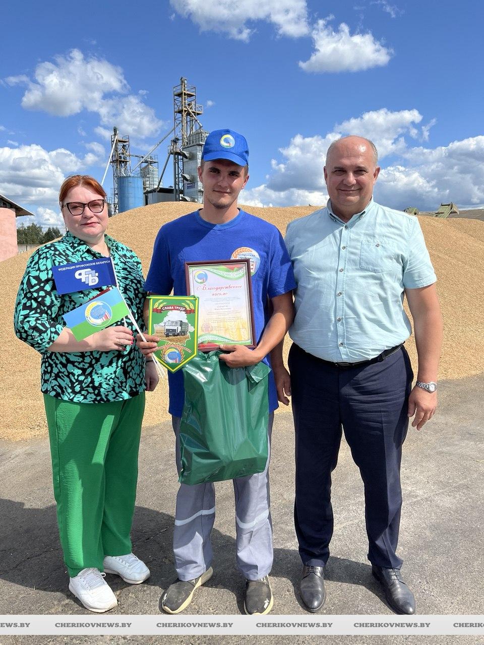 Молодого водителя ОАО «Чериковрайагропромтехснаб» Ивана Саракуло с первой перевезенной тысячей тонн зерна нового урожая поздравил председатель Могилевской областной профсоюзной организации Белорусского профсоюза работников агропромышленного комплекса Владимир Петрович.