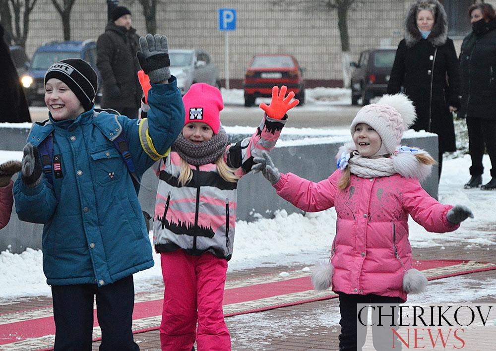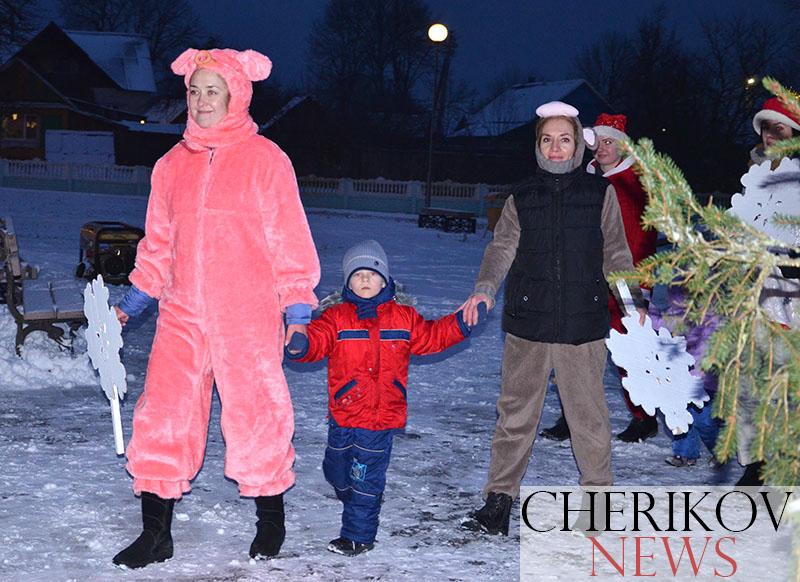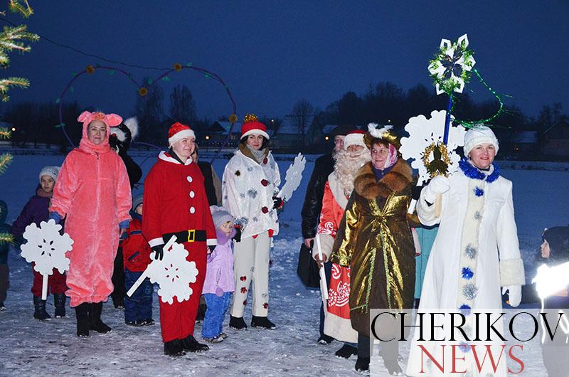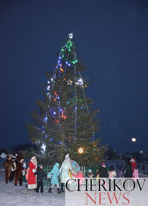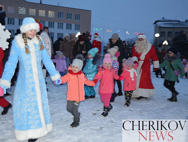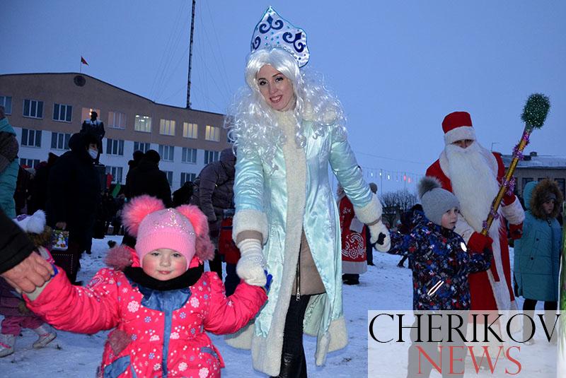Наконец наступил тот долгожданный момент, когда Дедушка Мороз трижды ударил посохом о землю, произнес волшебные слова, и зажглась новогодняя елка, а вместе с ней и те светящиеся фигуры, которыми украшен центр Черикова. Дети и взрослые, участники новогоднего шествия покружились вокруг главной новогодней красавицы, а после стройной колонной под музыку сказочного оркестра проследовали на площадку районного Дома культуры, где их ждали песни, танцы, игры. Работала также и новогодняя торговля, в объектах которой можно было приобрести горячие чай и кофе, сладости и разные кушанья, а также порадовать малышей яркими игрушками.