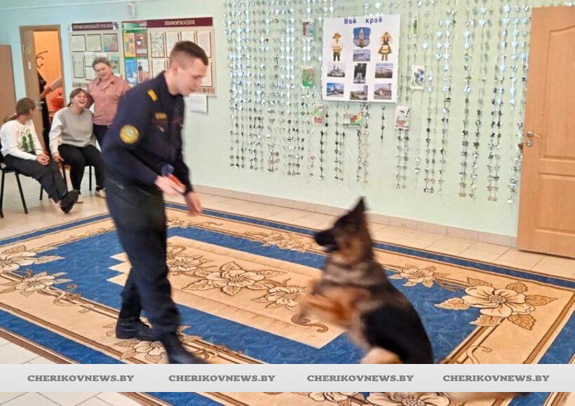 Первыми к ребятам пришли сотрудники Чериковского отделения Департамента охраны – начальник Олег Лавренов и милиционер-кинолог Владислав Довнар. Они подготовили для детей настоящее представление – показательное выступление милиционера-кинолога группы задержания с его верной «напарницей», служебной собакой по кличке Тинара.