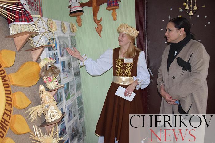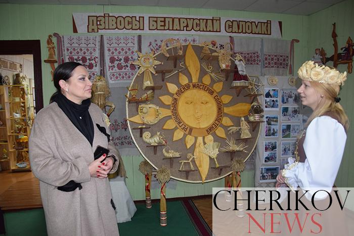 Начальник отдела Министерства культуры встретилась также и с работниками районного Дома ремесел, где ей продемонстрировали обширные выставки по соломоплетению мастеров Чериковщины, на которых были продемонстрированы рог изобилия, снопы, цветы из соломы, обереги, домовые и многое другое. Здесь же для учащихся лицея № 11 проходил мастер-класс по соломоплетению «Ромашка» в котором приняла участие и Виктория Леонидовна.