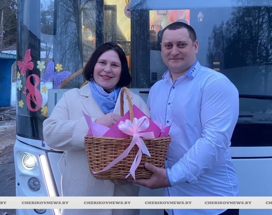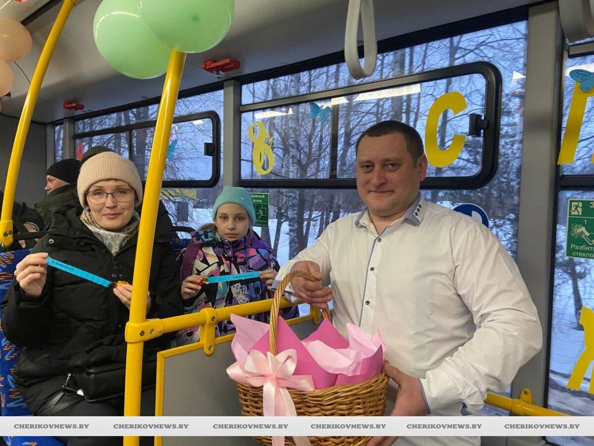 А еще женщин ждал приятный сюрприз — сладости с пожеланиями. В праздничные дни он будет курсировать по городу и району, радуя пассажиров не только комфортными поездками, но и особой атмосферой. А еще запланирован праздничный рейс в город Кричев.