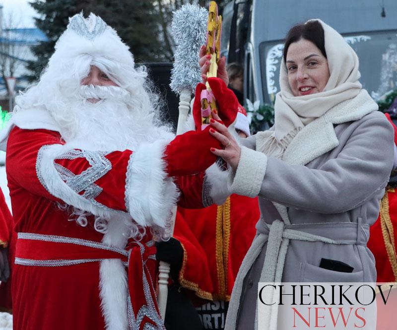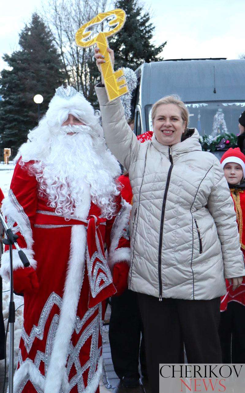 Ну а пятый заветный ключ главный волшебник праздника вручил начальнику отдела образования Чериковского райисполкома Татьяне Подобед и велел отварить им гаражи с колесницами Дедушек Морозов, чтобы доставить всех ребят на новогодние мероприятия.