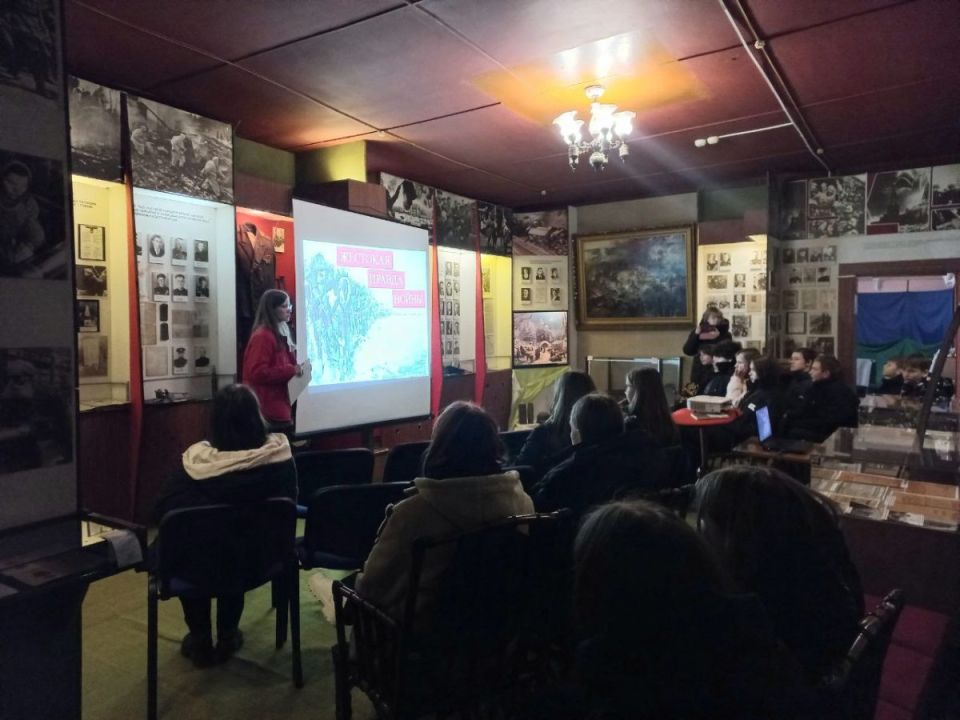 Научный сотрудник Захаренко Александра ознакомила ребят с историей возникновения понятия «геноцид», его признаками, а также вниманию учащихся был представлен небольшой список, содержащий сжатые описания актов массового уничтожения людей по рассовым, этническим, религиозным и классовым признакам.