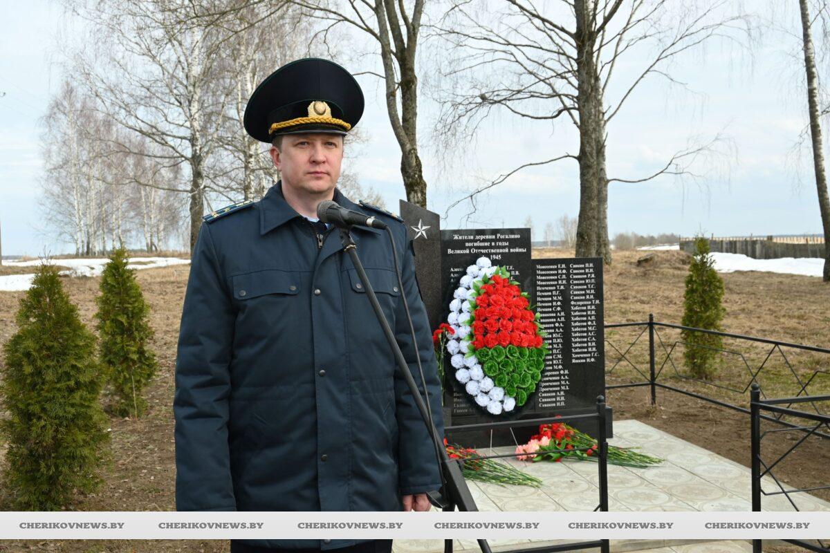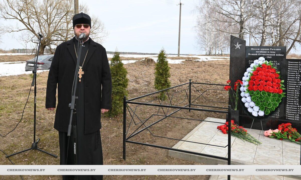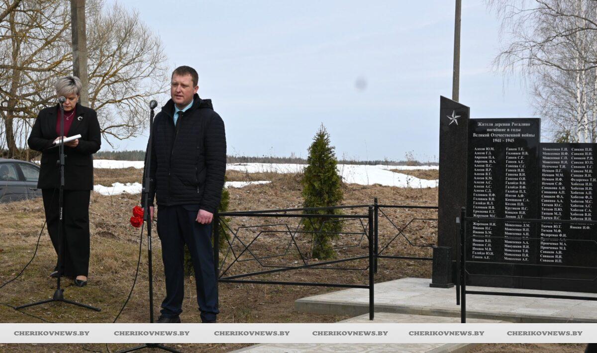 — Великая Отечественная война оставила много мест скорби на нашей белорусской земле и тяжелое наследие — память о страшных трагедиях и зверских преступлениях фашизма. Из более чем 12000 населённых пунктов, разрушенных и сгоревших в ходе вооружённых действий германских войск на территории Беларуси, судьбу Хатыни повторили 290, которые были полностью уничтожены вместе с мирным населением и не были восстановлены. На кладбище деревень мемориального комплекса «Хатынь» увековечена память о сожженных белорусских деревнях, разделивших судьбу Хатыни, в числе которых и наши – Бакуновичи и Рогалино, — отметил в своем выступлении Алексей Жерносеков. — Всего на территории Чериковского района было сожжено 85 деревень, три деревни — Бакуновичи, Рогалино, Сененка сожжены полностью, вместе с жителями. Последняя не восстановилась после войны. Сегодня мы собрались, чтобы склонить головы в знак глубокой скорби, почтить память тех, чьи жизни оборвались страшно и несправедливо. Нам никогда не забыть страшные страницы нашей истории. Мы никогда не простим жестокость, бесчеловечность и бесчинства врага на нашей земле. Мы это помним, и в этом наша сила. Каждый из нас своей жизнью, учебой, работой, службой, воспитанием детей должен поддержать нашу страну, сохранить память о погибших, уважительно относиться к историческому прошлому. Только так мы сможем сберечь и укрепить единство нашей страны. Вечная память убитым, замученным и растерзанным!