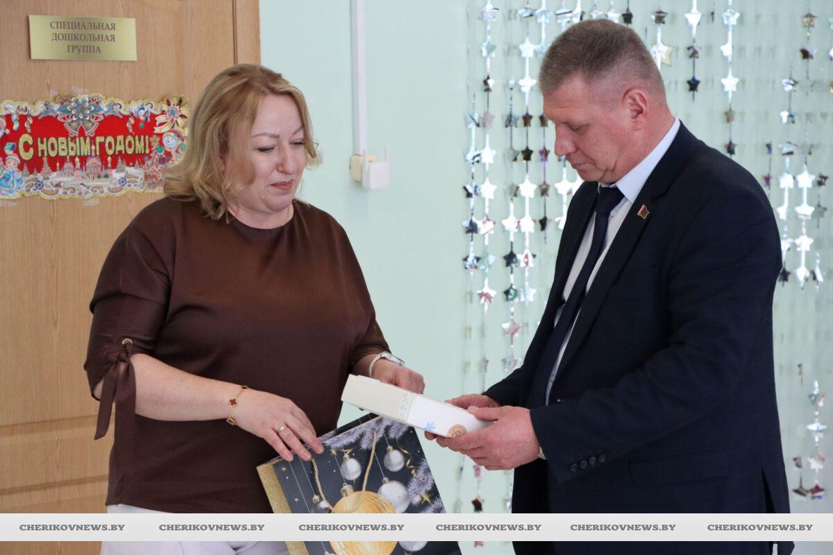 Поблагодарили за сказочную атмосферу и новогоднее представление ребят и педагогов также Сергей Давыдов, Наталья Фантанская и Дмитрий Ходос. Они отметили тот неоценимый труд, который совершают педагоги, чтобы даже особенные дети, насколько это возможно, научились понимать мир, выражать себя и находить своё место в нём. От депутата детишки получили сладкие подарки. От представителей лесной отрасли района ребятам также достались сладкие подарки, а еще, по традиции, настоящее новогоднее дерево в кадке — пихта, которая, в отличие от сосны и ели, имеет мягкие иголки и совсем не колется. От партии «Белая Русь» директору центра был вручен денежный сертификат на приобретение принадлежностей для занятий в кружке по рукоделию.