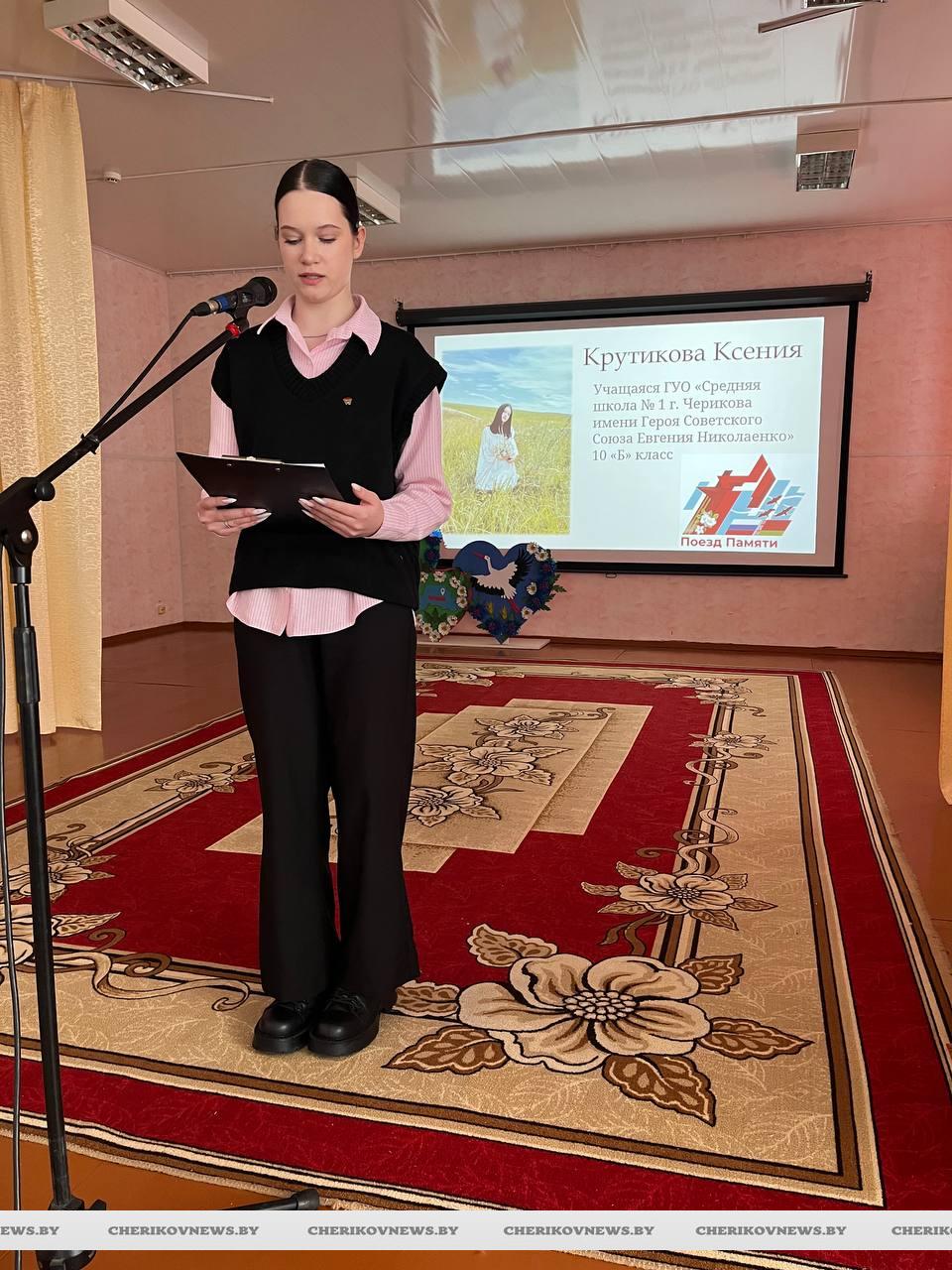 В Центре творчества детей и молодежи г. Черикова состоялся районный этап республиканского конкурса «Я патриот своей страны». Его участниками стали молодые люди — десятиклассники школ района, которые боролись за возможность представить Чериковщину в культурно-образовательной патриотической акции «Поезд Памяти».